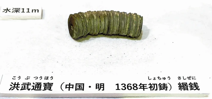 リング銭(銭緡、さし銭):ひもなどで連ねられた形で湖底に残されていた銭の束。