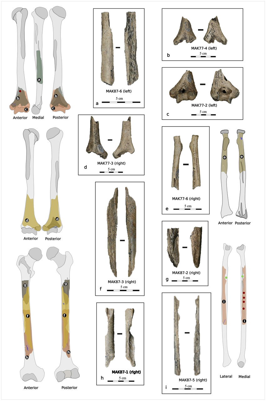 上腕骨や大腿骨、腓骨、橈骨なんかにも、筋肉を外したり関節を切り離したりする痕が見つかっている。