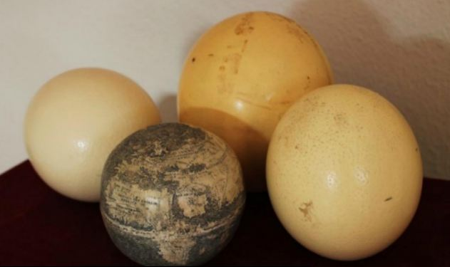 ダチョウの卵を半分に切断して、比較的真球に近い形態を有する下半分を2つ組み合わせて作られているのです。