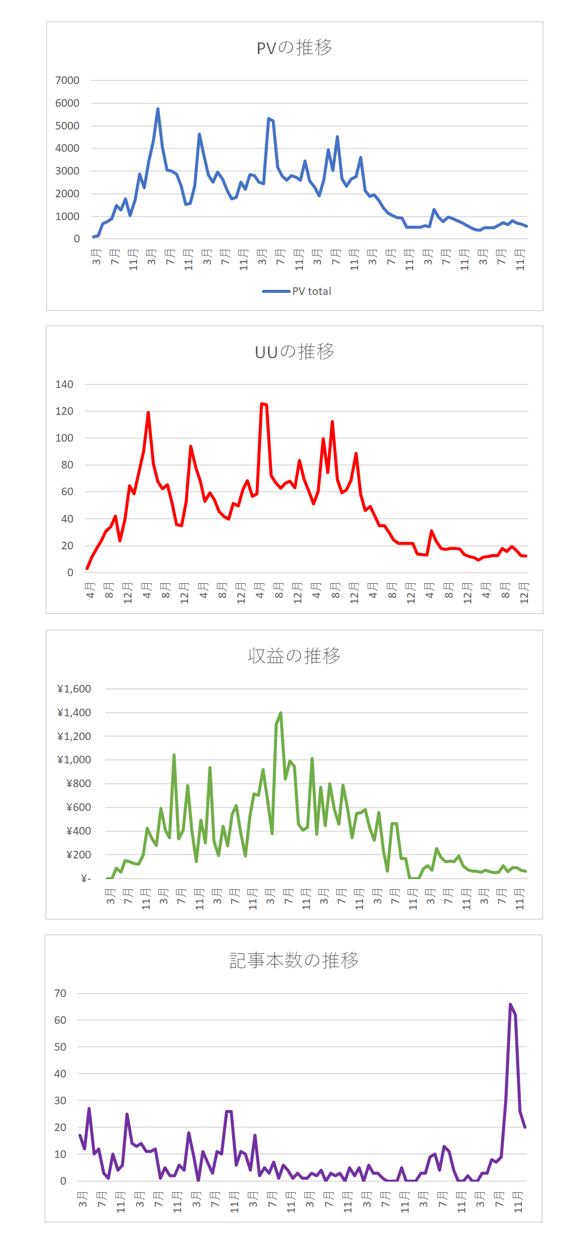 記事数は過去最高記録から落ち込んだけども日本語で月10本は書いてるのでまぁまぁかなって感じです。