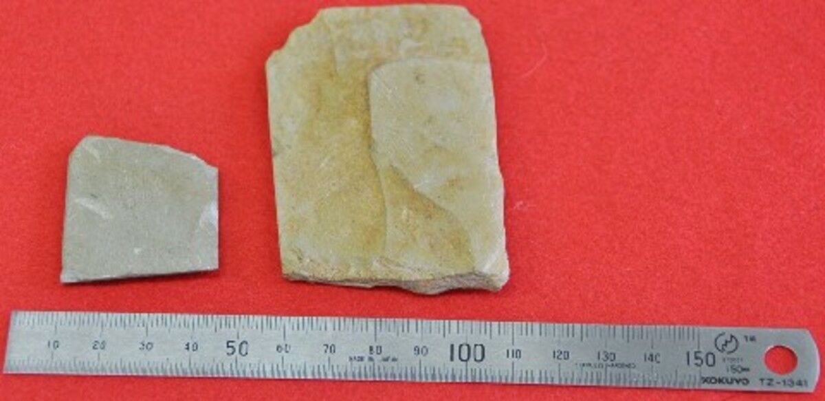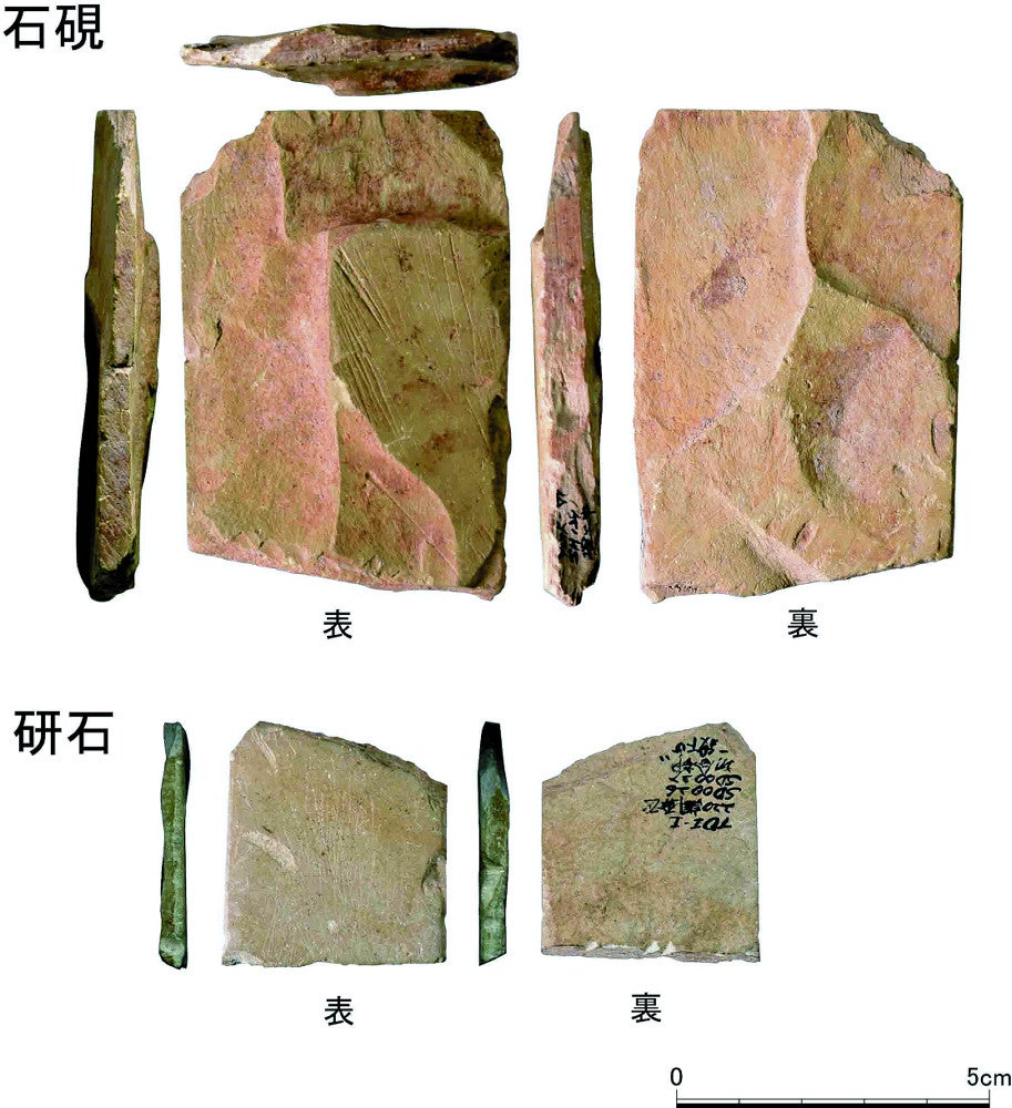 出土したすずりは石製で、長さ6・0センチ、幅4・3センチ、厚さ6ミリの破片。薄く裏面の粗い加工など中国・漢代の板石すずりと特徴が一致し、復元すると長さ10~17センチのほぼ長方形とみられる。弥生土器や朝鮮半島製の楽浪(らくろう)系土器が集積した「土器だまり」で見つかった。弥生時代のすずりは田和山遺跡(松江市)に続き国内2例目。