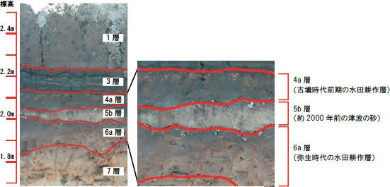 発掘調査から弥生時代に1度、この一帯が大きな津波被害を受けたことが確認されました。