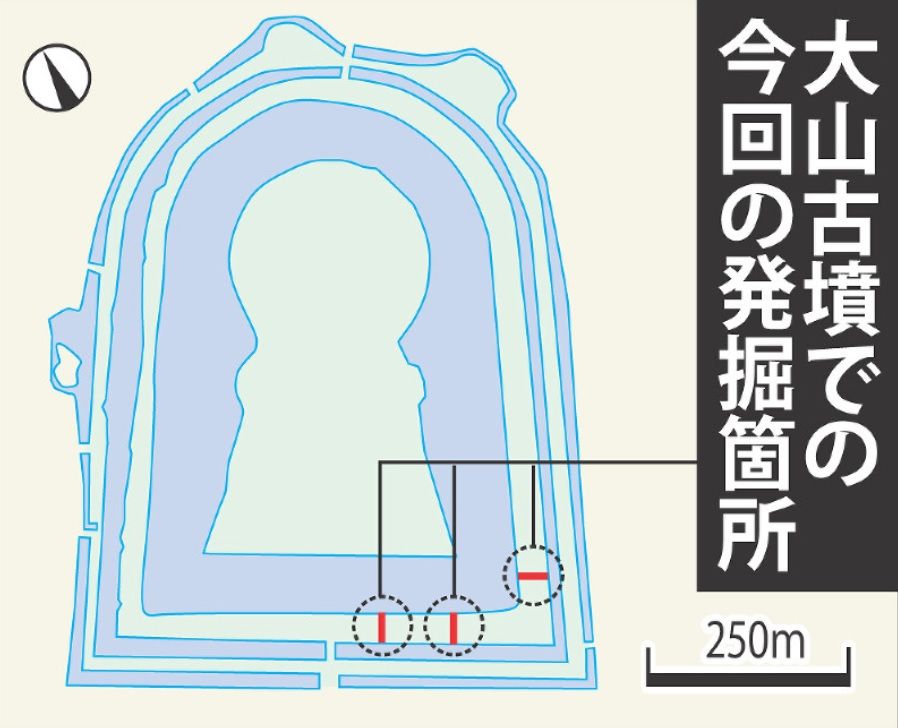 大山古墳は全長約500メートルで、三重の濠(ほり)が巡る。宮内庁は仁徳天皇の墓として管理するが、学術的には未確定。調査は10月下旬~12月上旬、埴輪(はにわ)列などがあったと考えられる最も内側の堤(幅約30メートル)に幅2メートルの調査区を3カ所設け、堺市の学芸員1人も発掘や報告書作成に加わる。宮内庁陵墓課は、今後も堤の別の部分や墳丘の裾などを発掘し、濠の水で浸食されている古墳の保存計画を作る。